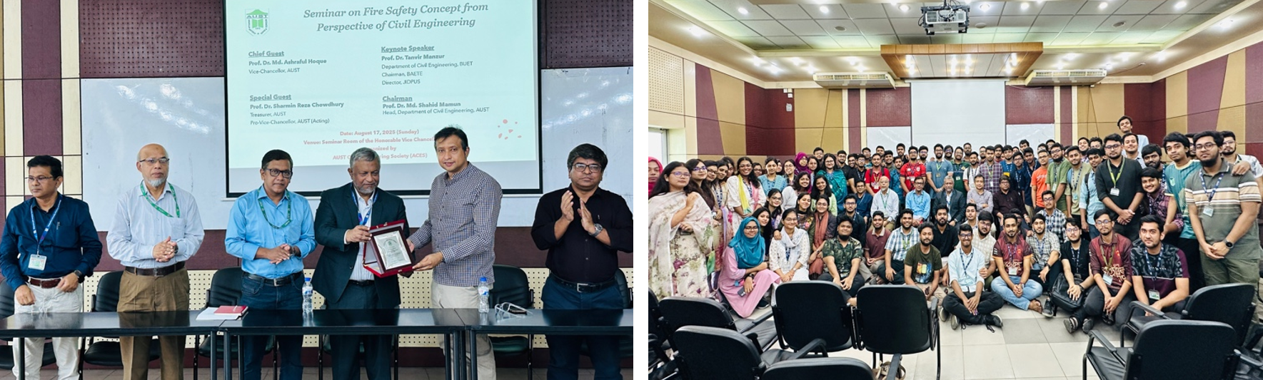 The AUST Civil Engineering Society (ACES) organized a seminar titled “Fire Safety Concept from Perspective of Civil Engineering” on August 17, 2025, at the Seminar Room of the Honorable Vice-Chancellor, AUST. The honorable Chief Guest, Prof. Dr. Md. Ashraful Hoque, Vice-Chancellor of AUST and the Special Guest, Prof. Dr. Sharmin Reza Chowdhury, Treasurer, AUST, graced the event with their presence. Prof. Dr. Md. Shahid Mamun, the Head of the Department of Civil Engineering at AUST, presided over the event as its chairman. The program was further enriched by the participation of several faculty members who played significant roles in ensuring the success of the event.