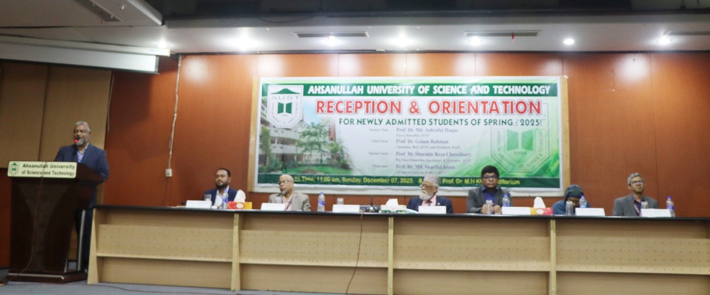 A day-long program for Reception and Orientation of newly admitted students for Spring-2025 Semester was organized at Ahsanullah University of Science and Technology on Sunday, 07 December 2025 at M.H. Khan Auditorium.