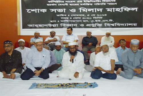 On 5th may 2014 Ahsanullah University of Science and Technology  observed a Condolence meeting and Milad Mahfil at the loss of 6 students of the Dept of CSE in Saint Martin Island  of Cox-Bazar on 14th April 2014.While celebrating the Pohela Baishak 9 students of Aust were swept away by the water of the sea.This tragedy raises a severe concern over security in the coastal areas.