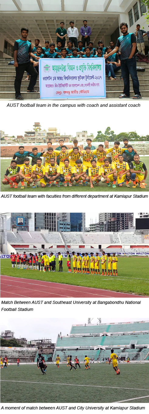 "Walton 1st Inter University Football Tournament 2017" was organized by "Sonali Otit Club" and "Green University, Bangladesh". The aim of this tournament was to promote football amongst the students. This would help reducing the students to get diverted towards the anti-social activities. The event started on 12th July 2017 and ended on 27th July 2017. A total of 20 public and private universities took part in this tournament. The venues were Bangabondhu National Football stadium and Bir Sherestha Shaheed Shipahi Mostafa Kamal Stadium, Kamlapur. For the first time a team from "Ahsanullah University of Science and Technology" has participated in any national competition like this.